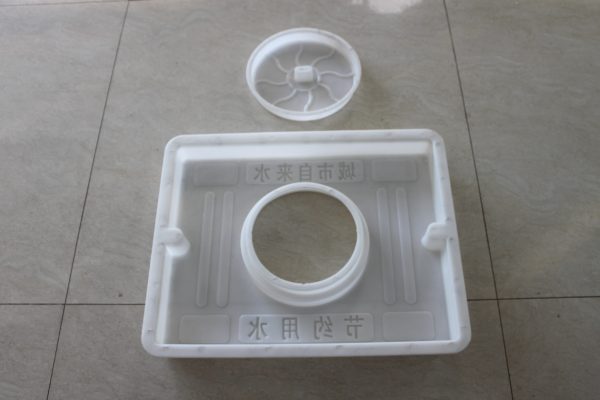 此水泥方井蓋模具采用聚丙烯樹脂經(jīng)注塑加工而成,模具兩端以小開口設(shè)計(jì),以方便后期檢查時(shí)的位置移動。在方井蓋模具的表面加以防滑條及供水部門專屬字樣,即“節(jié)約用水”和“城市自來水”標(biāo)志。而在方井蓋模具的中間設(shè)立一個(gè)小型的圓孔蓋座,為日后水廠對于自來水管的檢查工作帶來更大便利。