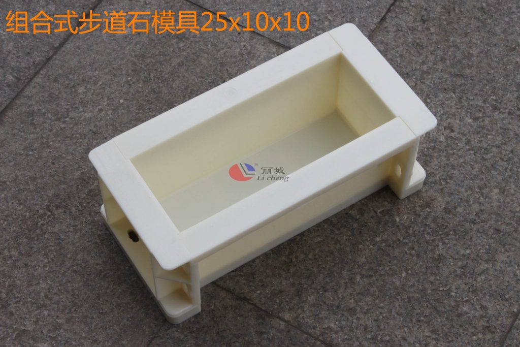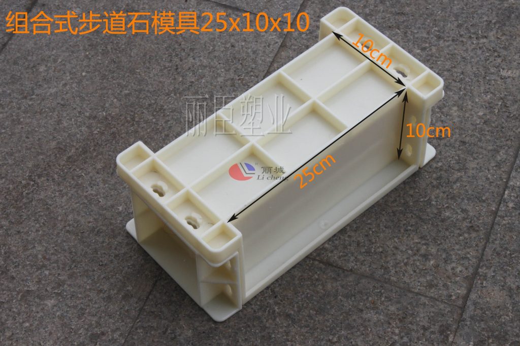 塑料模具本身的規格的25x10x10cm,而堵在模具兩邊的堵頭規格為10x10cm。這樣的設計主要是對于步道石模具在澆筑成型后脫模過程中較為便利,只需將固定組步道石模具的鎖扣進行拆除后,便能較為便利的進行模具的脫模,所以麗臣在對著款模具上取名為組合式步道石模具。