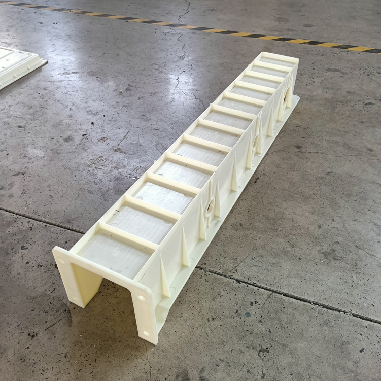 高鐵路基橋梁周圍、三孔立柱塑料模具,模具主體設有圓孔,預制時搭配塑料圓管使用,預制成型后用圓形鋼管連接使用,一般用在橋梁周圍做防護使用。