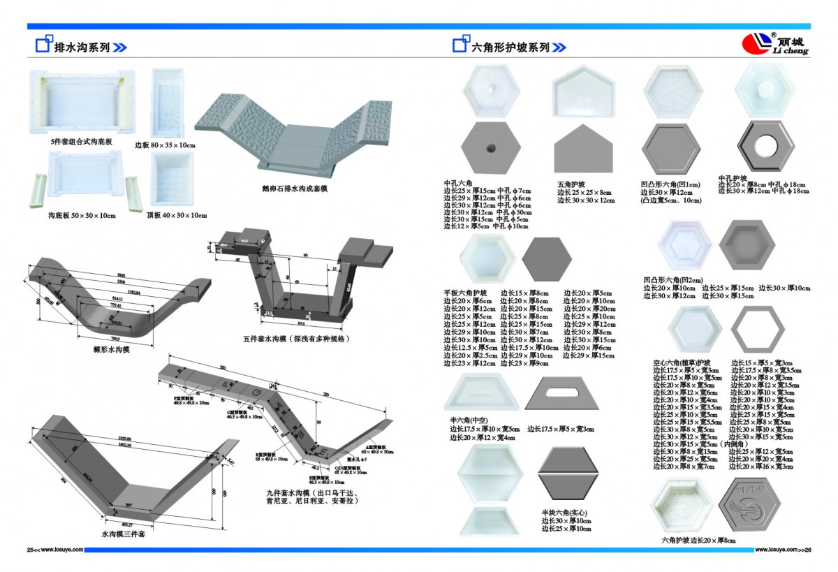 麗臣塑業(yè)主營產(chǎn)品:現(xiàn)澆塑料模板,六角護坡模具、高鐵水泥護欄模具、溝蓋板模具、路沿石模具、彩磚模具、井蓋模具等一系列水泥制品塑料、鋼模具及配套的機械設(shè)備配件等,如條紋磚條紋機、脫模機、高鐵護欄離心機、加料機等。