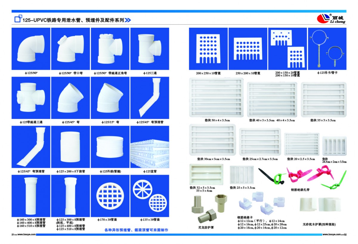 30頁:各地生產(chǎn)施工現(xiàn)場 ? ? ? ? ? ? ? ? ? ? ? ? ? ? ? ? ? ? ? ? ? ? ? ? ? ? ?31-32頁:125-UPVC鐵路專用泄水管、預(yù)埋件及配件系列